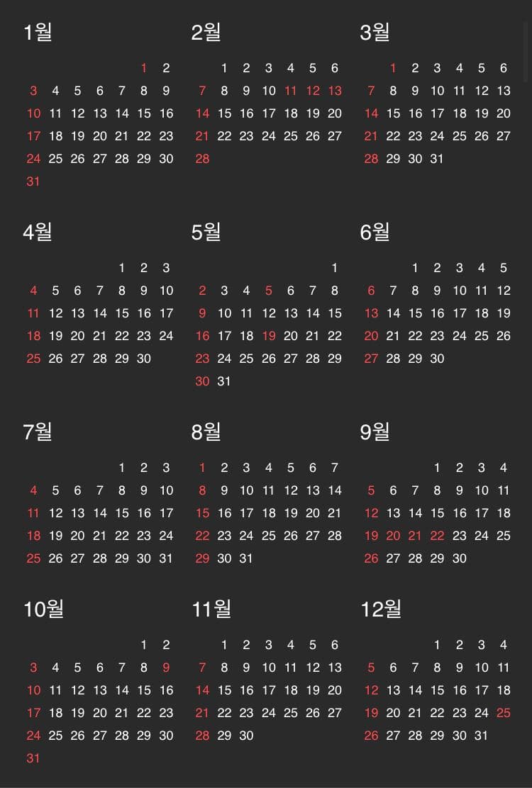 월별 연휴 + 황금연휴