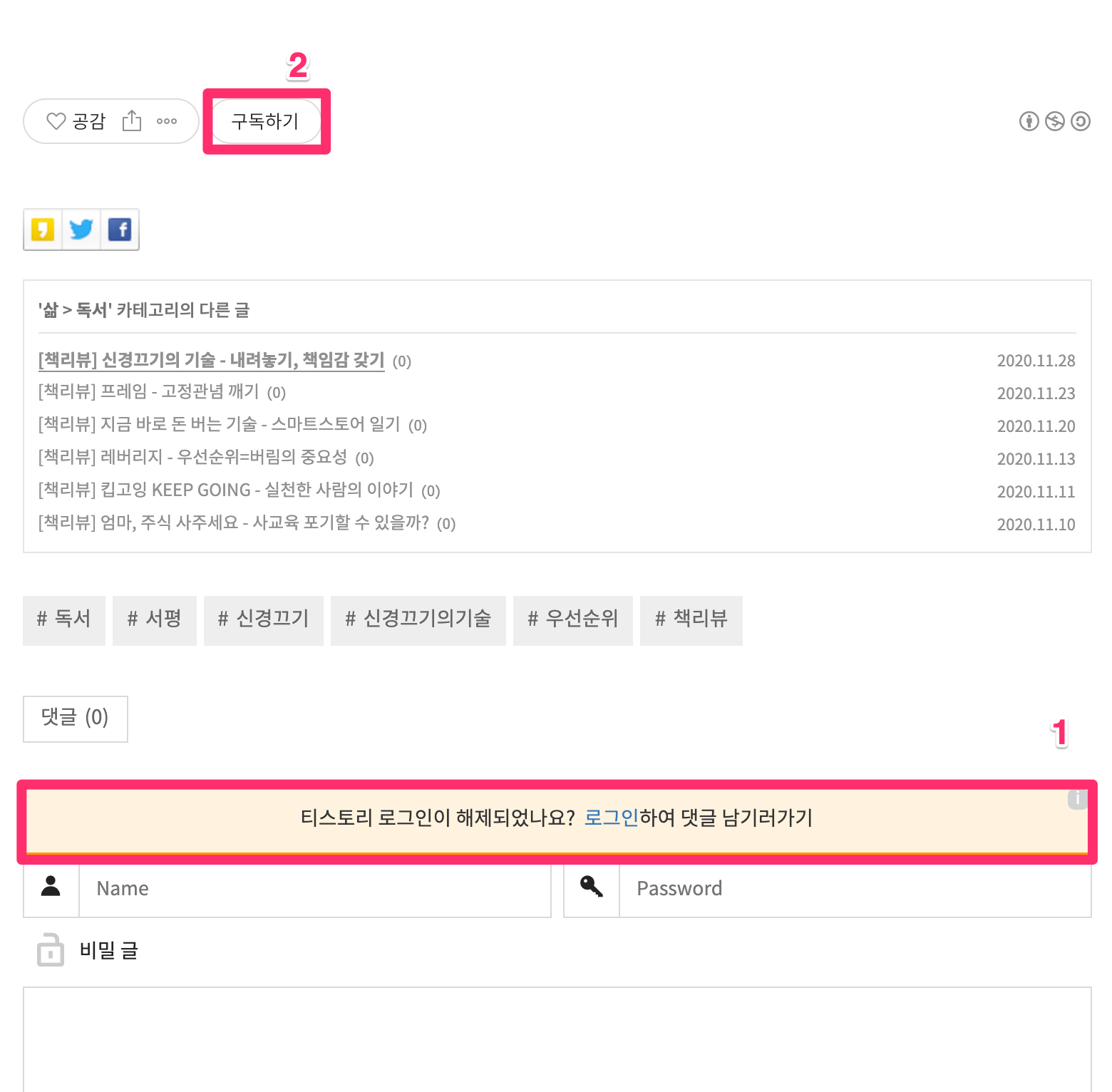 - 이 때, 댓글도 남길 수 있고, 2번의 "구독하기"를 클릭하여 해당 블로그를 구독할 수 있습니다.