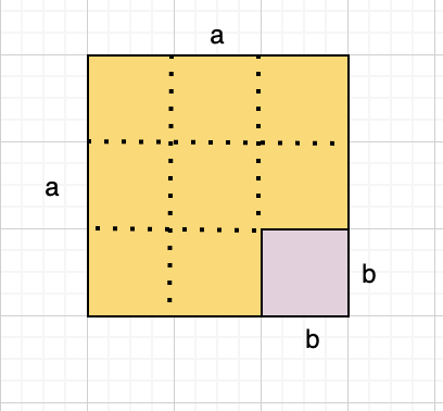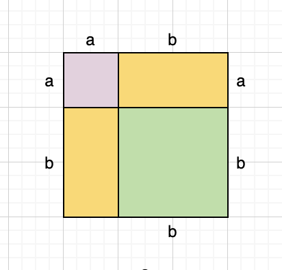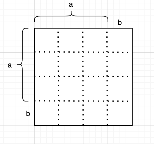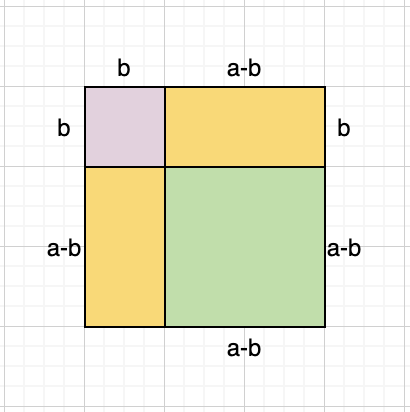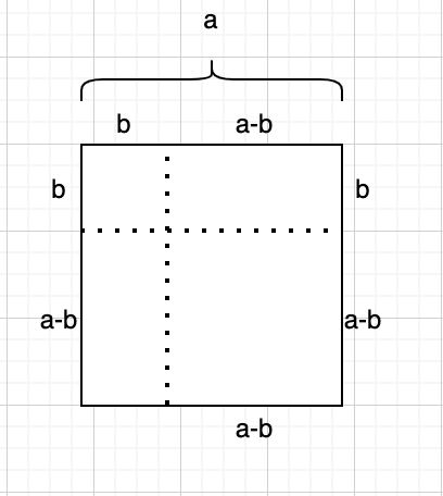 한 변의 길이가 a인 정사각형이 있고, 그 정사각형 속에 작은 정사각형 b가 있는 모습을 상상해 봤습니다. 그러면, 큰 정사각형의 한 변 a = (a - b) + b로 볼 수 있습니다. 다음 그림을 봐주세요.