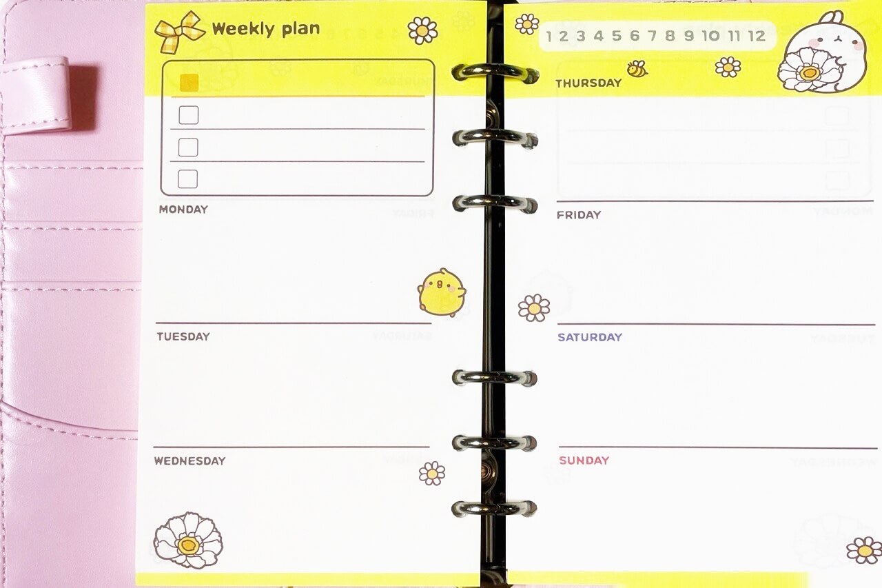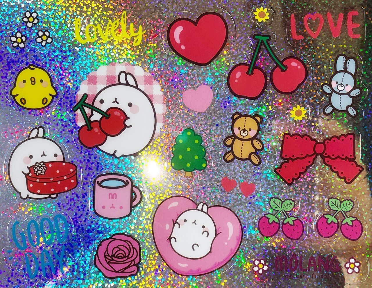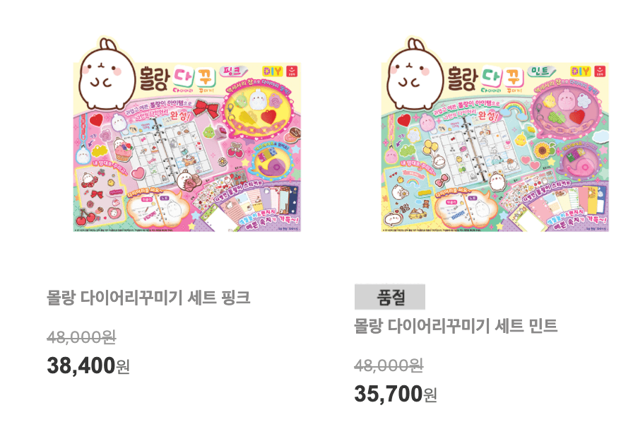 구성품 자체를 그대로 다시 팔지는 않지만, 몰랑이 스티커는 모x글로리 등 문구점에도 많이 팔기 때문에, 스티커는 유사품으로 구하기 쉬울 거예요. 다이어리 속지는 규격에 맞는 호환되는 것으로 리필하면 됩니다. 같은 디자인은 구하기 어려울 수도 있겠네요.