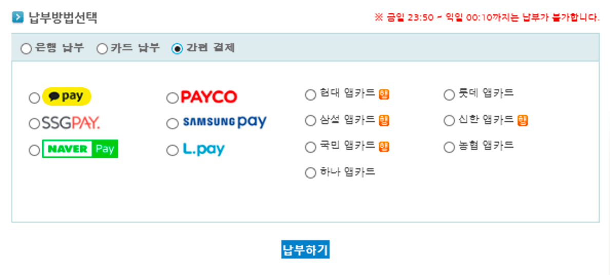 개인정보를 입력하면, 얼마를 납부해야한다고 뜹니다. 개인가상계좌 번호도 나타납니다. 그리고, 아래로 스크롤 하면, 계좌이체/신용카드/간편결제 등을 선택할 수 있습니다.