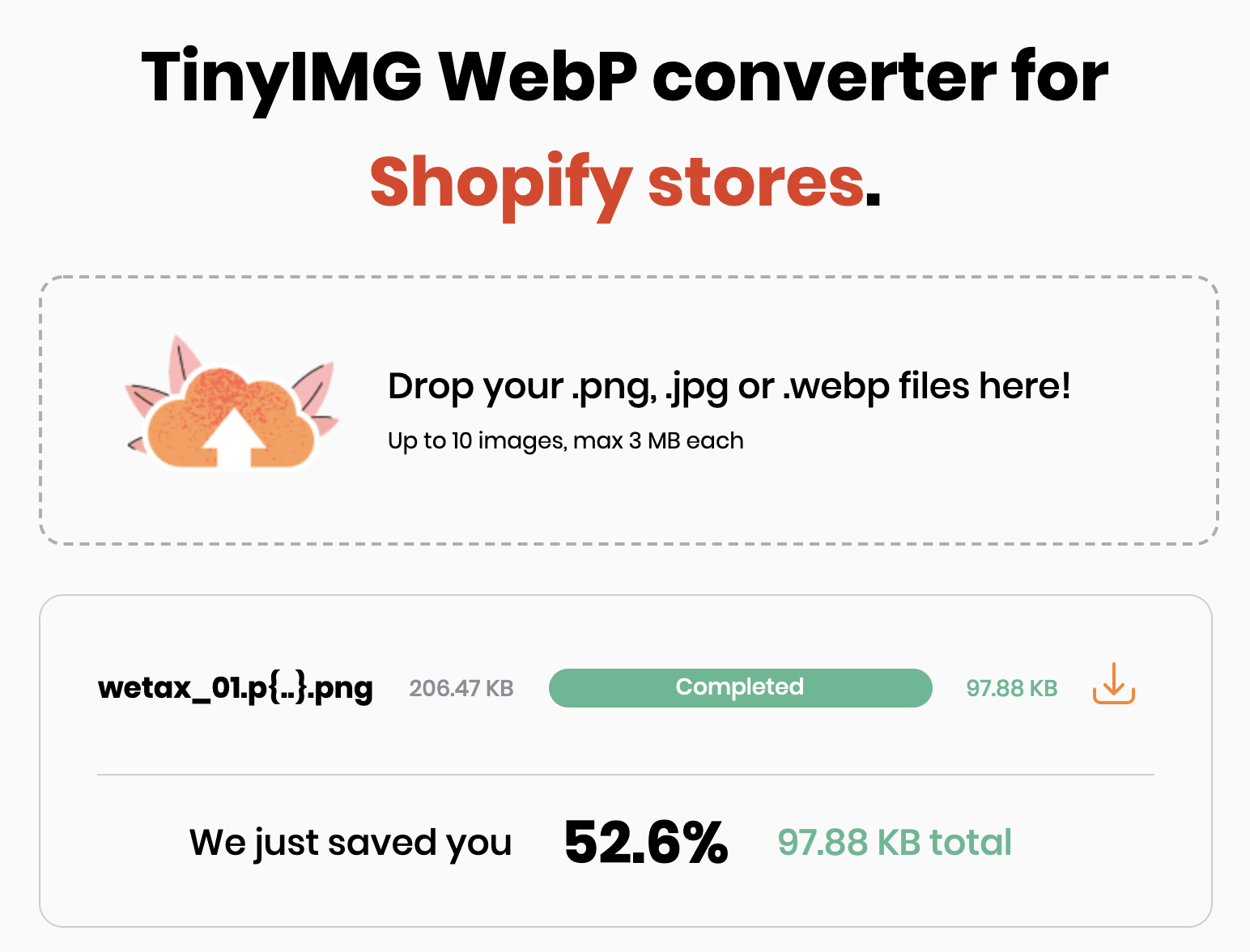 Use TinyIMG to convert your Shopify images to WebP format and instantly make your file sizes around 30% smaller!
