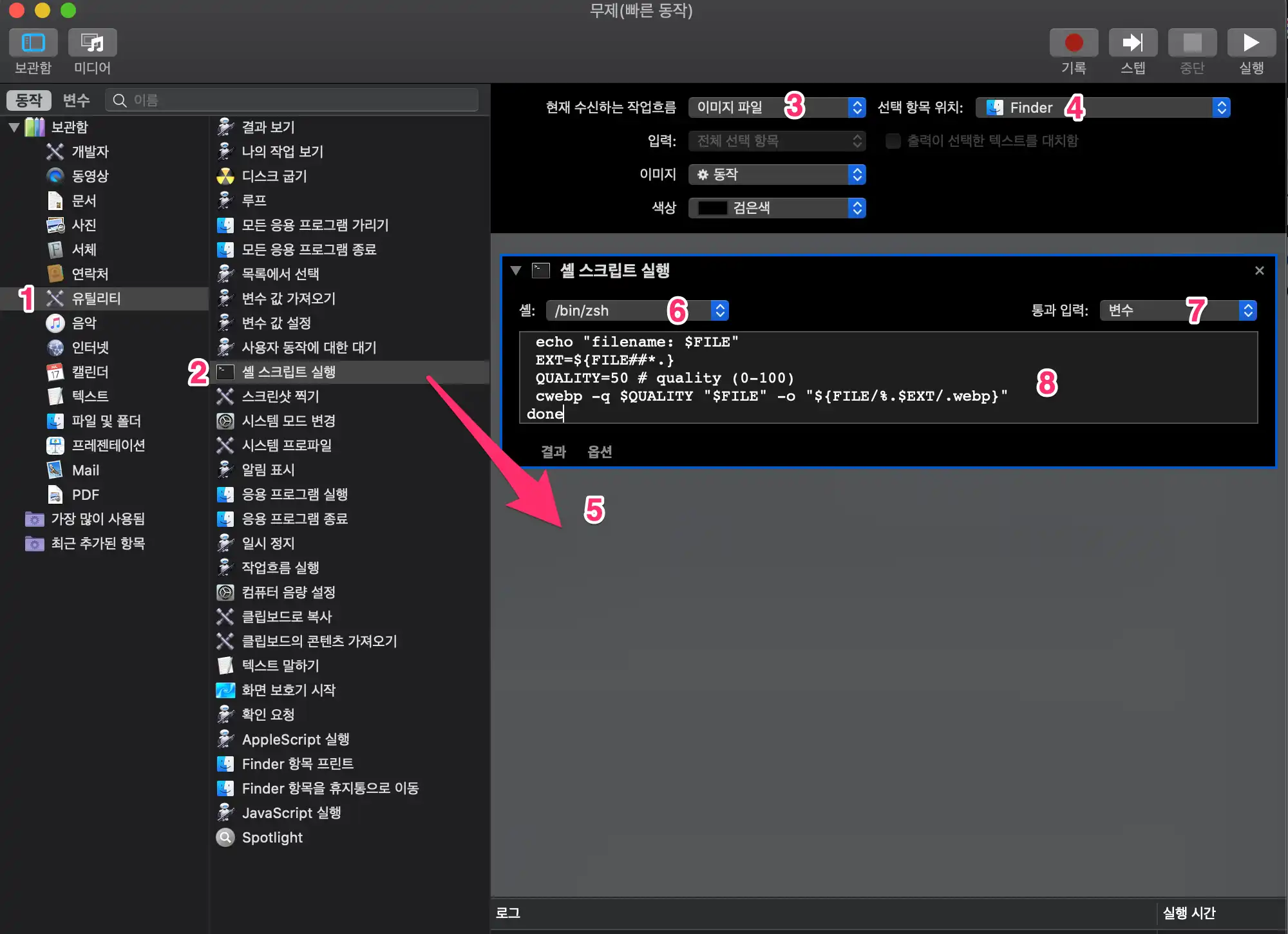 - 5) 2번에서 고른 셸 스크립트 실행 아이콘을 5번 화살표 방향으로 드래그&드랍 합니다.