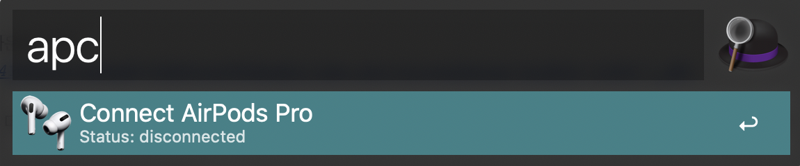 - alfred를 실행하여 에어팟 설정을 한다. (최초 1회만 하면 됨)라고 입력한다.