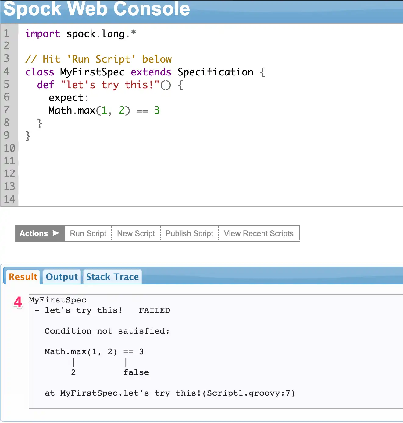 1에 표시한 영역에는 Spock 코드를 작성하면 된다. 사이트에 접속하면 화면과 같은 샘플코드가 먼저 작성되어 있다. 테스트 코드를 작성 한 후, 2에 표시된 바와 같이 "Run Script"를 실행하면 테스트 결과가 3의 영역에 표시된다.