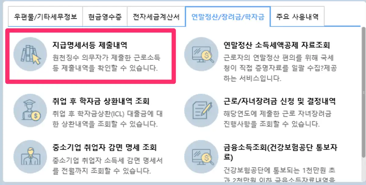 위와 같은 화면이 중간에 뜨면 연말정산/장려금/학자금 탭을 선택합니다. 이후, 지급명세서등 제출내역을 클릭합니다.