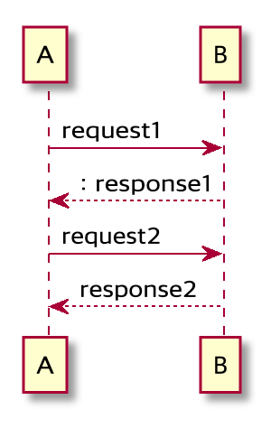 이렇게만 작성하면, A에서 B로 이어지는 실선 화살표와, B에서 A로 이어지는 점선 화살표를 확인할 수 있을 것이다. 콜론(:) 뒤에 기록한 글씨는 화살표 위에 출력할 메시지의 내용이다.