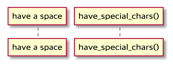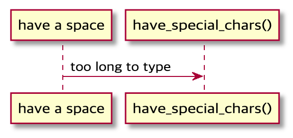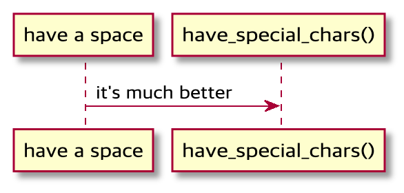별칭 지정: 참여자의 원본 이름이 너무 길거나 공백문자가 포함되어 따옴표로 묶어줘야 한다면 이후 문서 작성이 힘들다. 별칭을 지정하여 문서작성의효율을 높이자. 참여자 as X 와 같은 식으로 뒤에 as X를 붙여주면, X로 별칭을 지정할 수 있게 된다. 이후 문서에서는 원본 이름대신 X를 대신 사용할 수 있다.