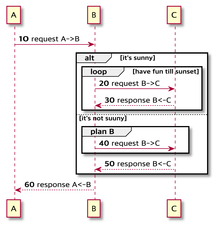 위와 같이, alt/else와 group, loop 등을 활용하여, 논리적인 그룹을 적절하게 표현할 수 있다.