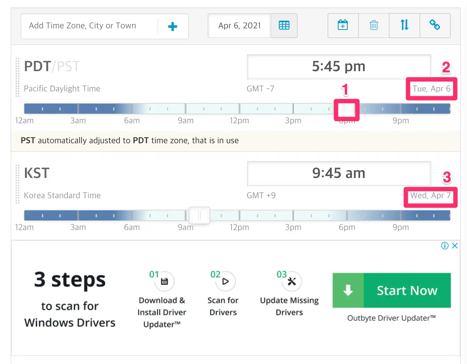(2)와 (3)에 표시되는 날짜를 확인해 보세요. PST(PDT) 혹은 EST(EDT)와 KST의 시간대와 날짜까지 실수하지 않고 변환할 수 있습니다.