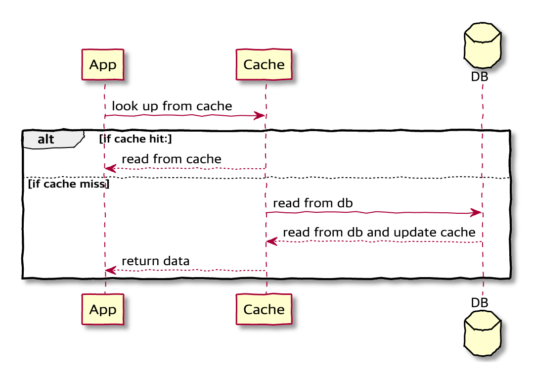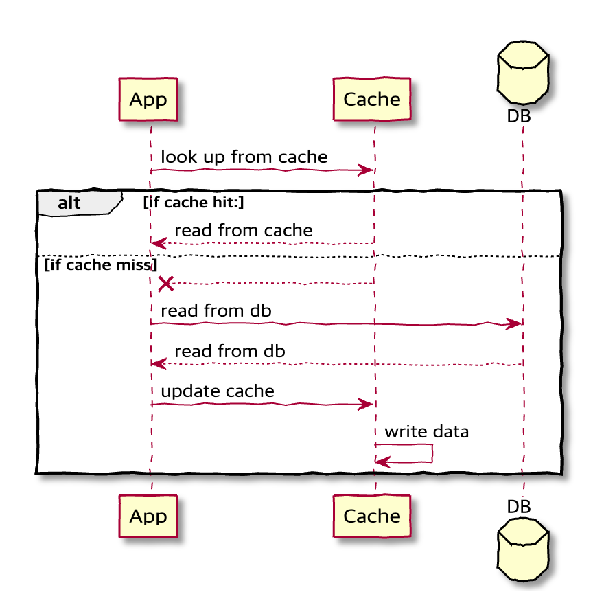 캐시는 데이터베이스와 직접 연결되지 않고, 애플리케이션이 주체가 된다. 애플리케이션이 요청을 받으면, 데이터가 캐시에 있는지 먼저 검사를 하며, 그 결과(캐시에 데이터가 로딩되어 있는지 여부)에 따라 다음 액션이 결정된다. 캐시에 데이터가 없다면, 애플리케이션이 캐시에 데이터를 업데이트 한다. 캐시에 대한 의존성이 낮으므로, 캐시가 다운되더라도 원천 데이터베이스로 서비스를 계속할 수 있다. 읽기 요청이 많은 경우에 적합하다.