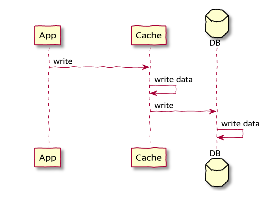 Read-Through와 마찬가지로 애플리케이션이 직접 바라보는 것은 데이터베이스가 아니라 캐시가 된다. 마찬가지로 캐시가 주 데이터스토어의 역할을 수행한다. 데이터베이스로 동기화하는 몫은 캐시에 위임된다. 데이터가 캐시와 DB에 모두 반영이 되었을 때를 정상적인 쓰기 오퍼레이션이 성공한 것으로 간주한다. 캐시와 데이터베이스에 모두 데이터를 기록하기 떄문에 신뢰성이 더 높아진다. 즉, 장애발생시 데이터를 유실할 가능성을 낮춰준다. 게다가, 캐시와 데이터베이스의 데이터/ 상태 불일치 문제도 해결할 수 있다. 그러나, 캐시와 데이터베이스 두 곳에 모두 기록해야 하므로, 쓰기 레이턴시가 증가한다. 요청 클라이언트에게 피드백을 하는 시점은 캐시와 데이터베이스를 모두 업데이트한 후가 된다. 기록한 데이터를 다시 자주 읽는 경우에 좋다.