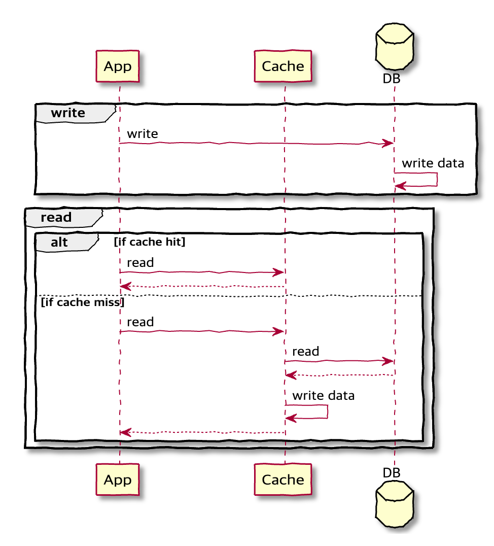 쓰기 요청이 캐시를 거치지 않고, 데이터베이스에 직접 전달된다. 데이터는 쓰기 오퍼레이션에 의해 캐시에 업데이트 되지 않는다. 캐시에 데이터가 로딩되는 시점은, 언젠가 해당 데이터가 캐시에 요청이 되고, miss가 발생했을 때이다. 즉, 읽은 데이터만 캐시에 로딩된다. 기록하는 데이터가 자주 사용되지 않는 경우에 적합하다.