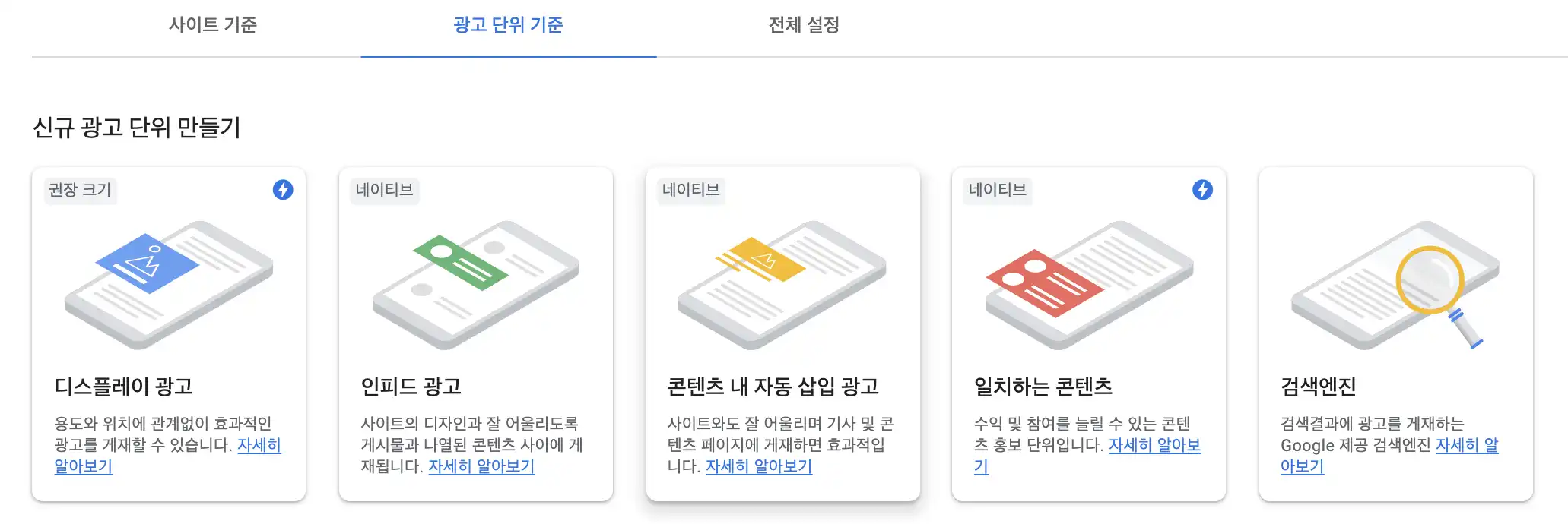 애드센스 관리 페이지에 방문해보면, 어느 순간 기존에 보이지 않던 메뉴가 아래처럼 보이게 됩니다. 아래와 같은 기능이 활성화 되었을 때 비로소 일치하는 콘텐츠 광고를 넣을 수 있습니다.
