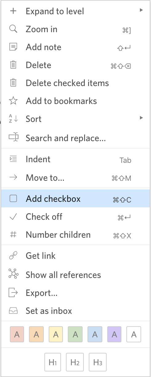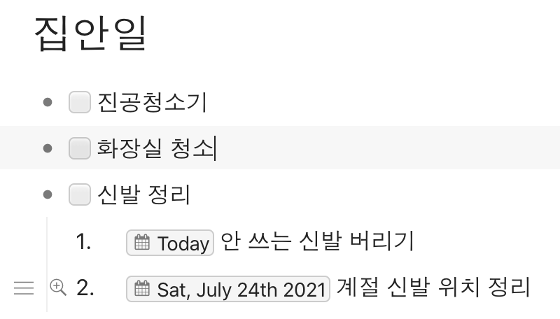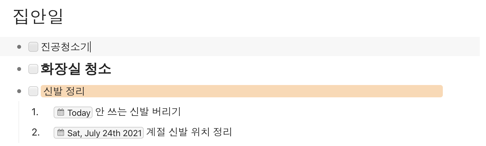 Dynalist에는 자체적으로 체크리스트 형태로 아이템을 등록하고 관리할 수 있다. 즉 생각을 정리한 후, 실행으로 옮기기 위해 별도의 툴을 사용할 필요 없이 자체 툴내에서 아이템들을 체크리스트로 그대로 쓸 수 있다.