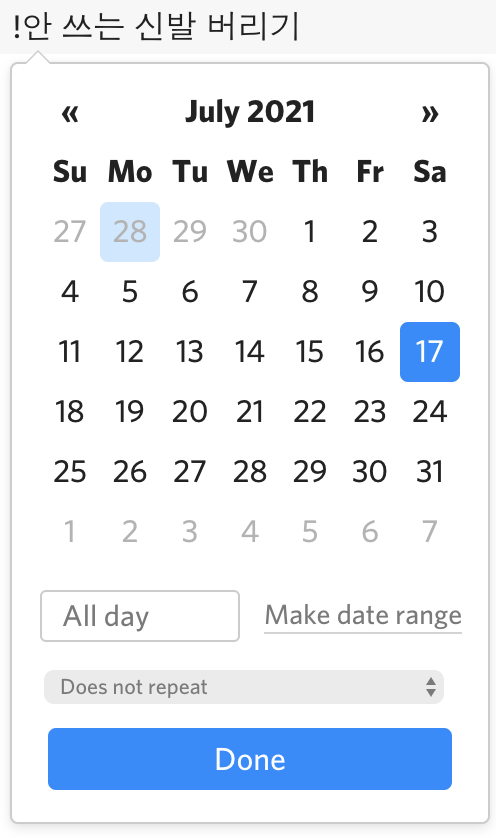 물론, Workflowy에서도 옵션을 켠 후에, 날짜를 입력할 수 있긴 하지만, Dynalist는 좀 더 사용하기 쉬운 형태의 캘린더를 지원한다. !(느낌표)를 입력하면 캘린더 선택창이 뜨는데, 원하는 날짜를 선택 지정하면 된다. 혹은 !(날짜) 형태로 표기해도 된다.