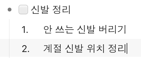 리스트를 작성한 후, 아이템에 커서를 올리면 왼쪽 편에 뜨는 메뉴를 클릭할 수 있다. 그 메뉴에서 체크박스를 추가한다고 클릭하면 해당 아이템은 체크박스형 아이템으로 바뀐다.
