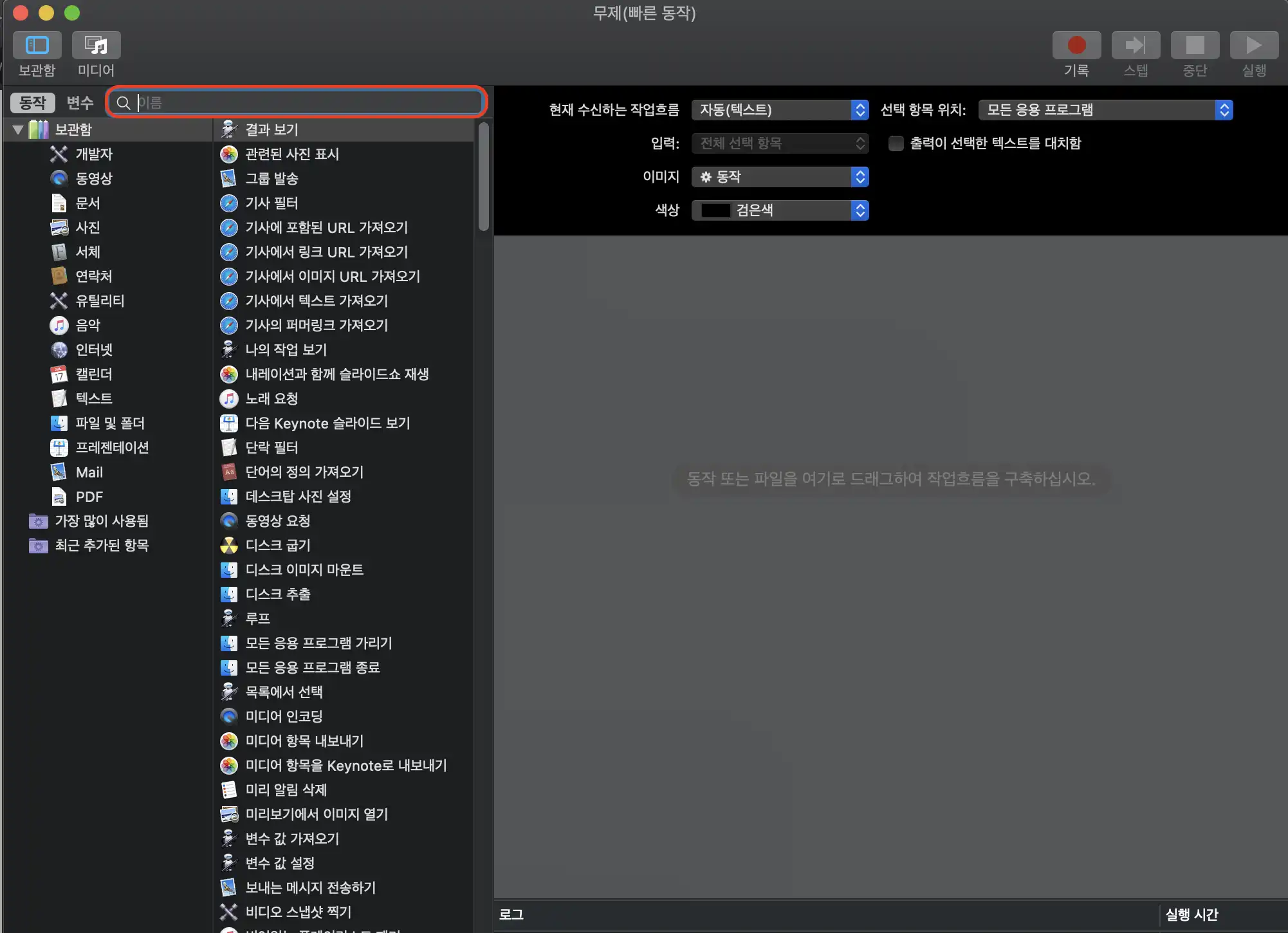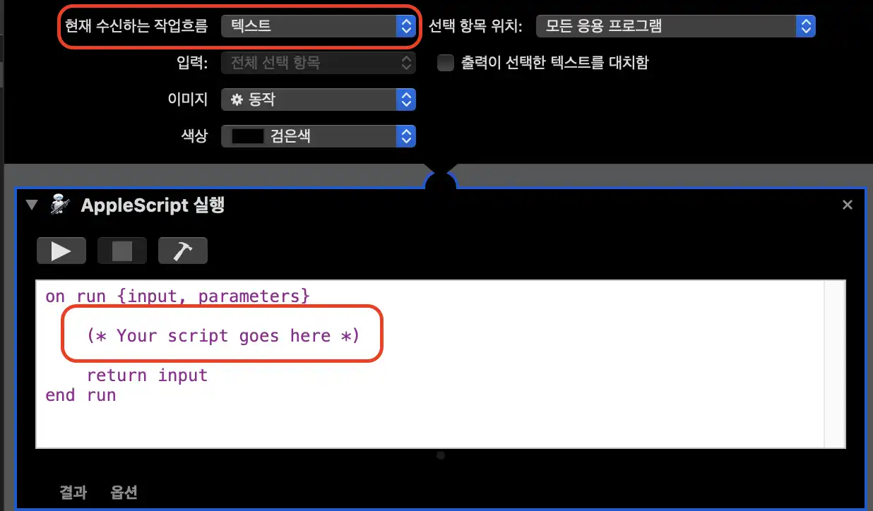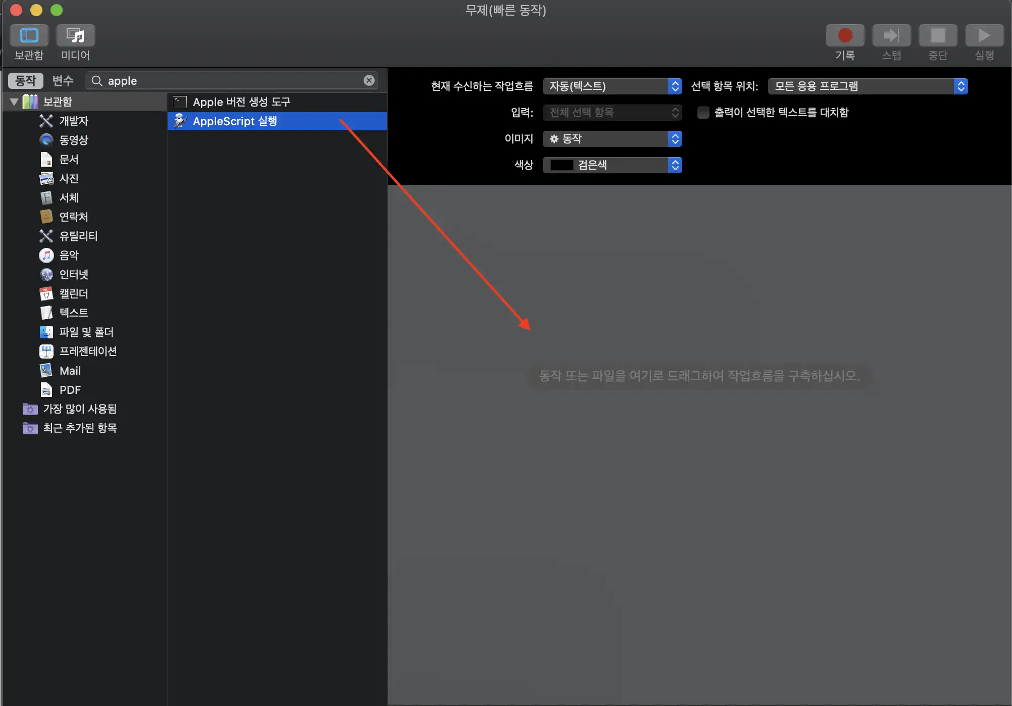 AppleScript 실행 항목을 화살표 영역으로 드래그 & 드랍합니다.
