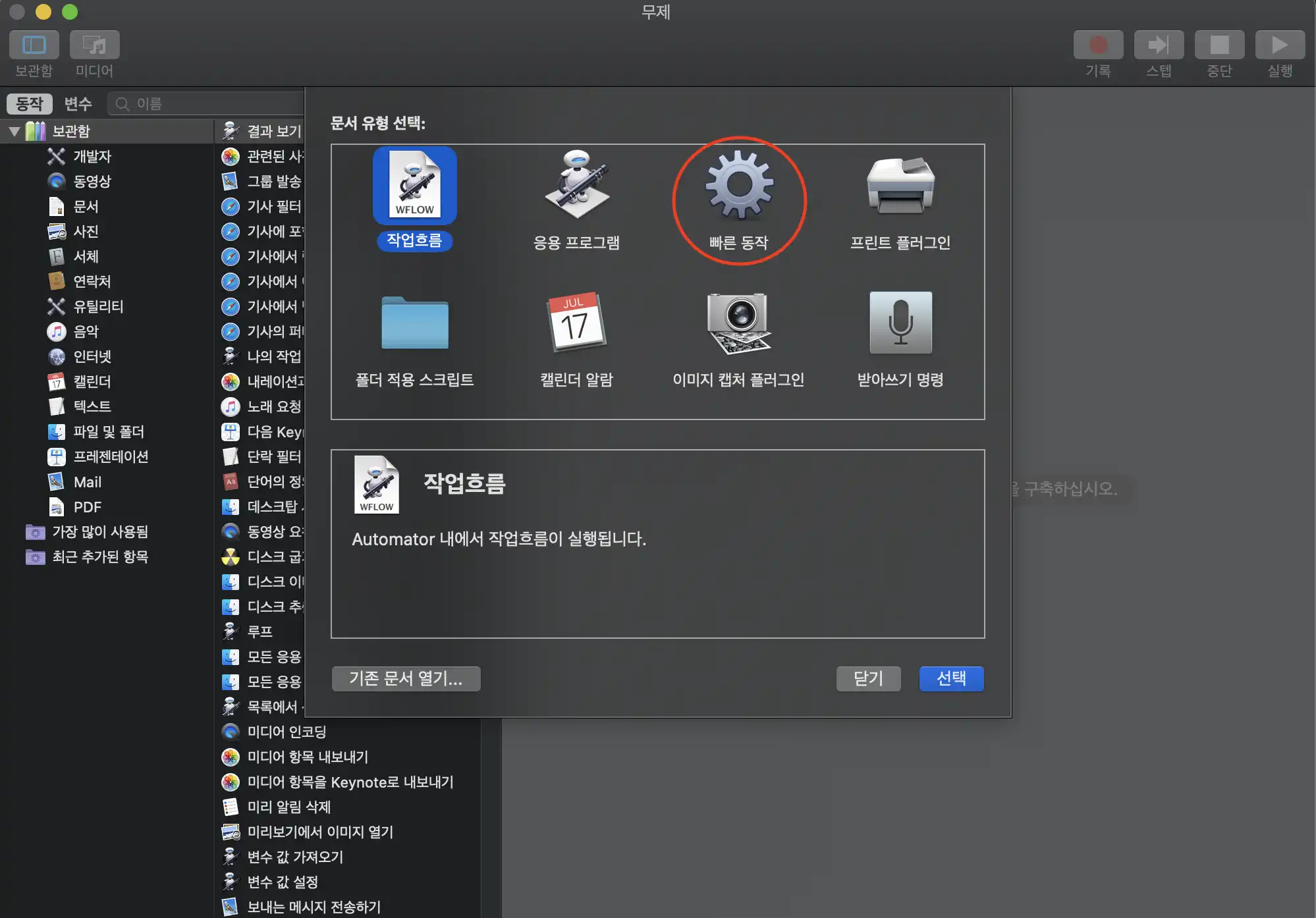 맥북의 Alfredo나 Spotlight를 실행해서 Automator를 찾습니다. 실행하면 아래와 같은 초기화면이 뜨는데,