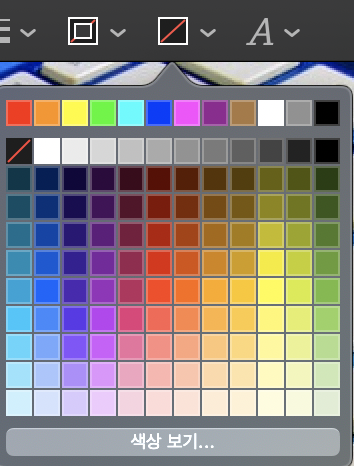 두 기능이 나란히 배치되어 있는데, 각각의 버튼을 클릭하면 비슷한 색깔 팔레트가 뜬다. 테두리 색상은 선의 색깔을 고르는 것이고, 색상 채우기는 도형의 영역 내부를 선택한 색깔로 채워준다. (예: 사각형, 별표, 원 색깔 채우기 등)