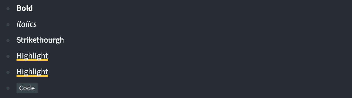 만 동작한다. 따라서, logseq와 obsidian 두 개의 툴을 혼용한다면 문자열 강조시에는 ==내용==의 표기법을 쓰자. 위의 글자 꾸미기 예제를 참고하자.