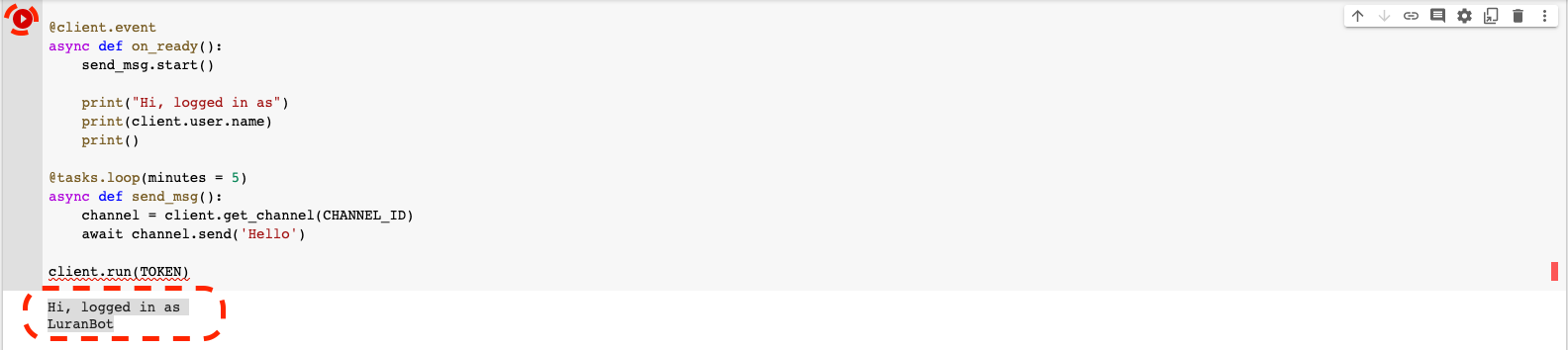 단, 디스코드 채널 등 기본 셋업이 되어 있다는 전제하에, 다음의 코드를 실행해 보자.