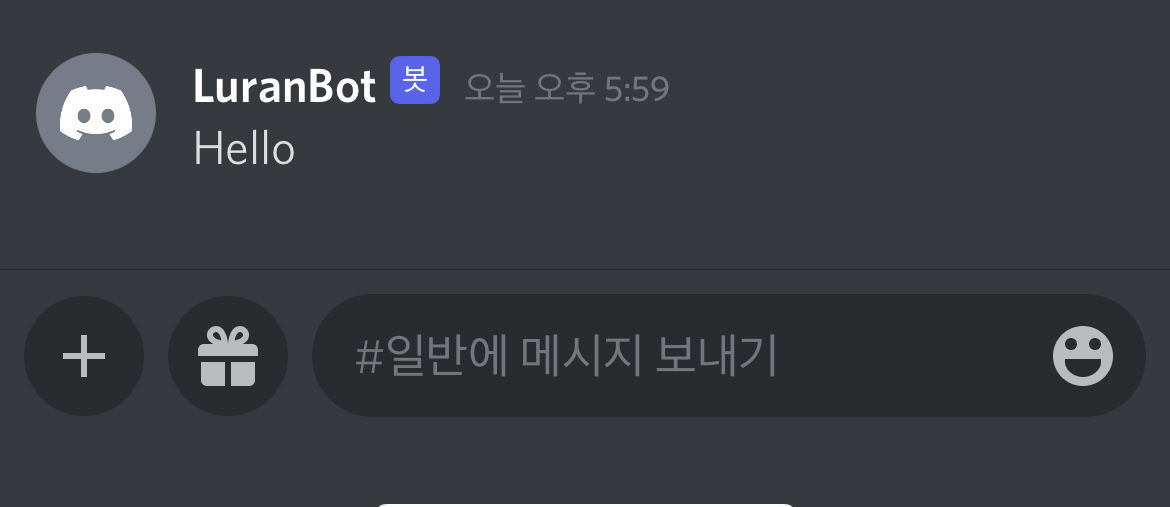 를 실행하면 discord.py가 실행된다. 이후, 디스코드 봇의 코드를 실행시켜 정상적으로 채널에 메시지가 발행되는지 확인해 보면 된다. 앞에 느낌표를 붙이고 실행하자.