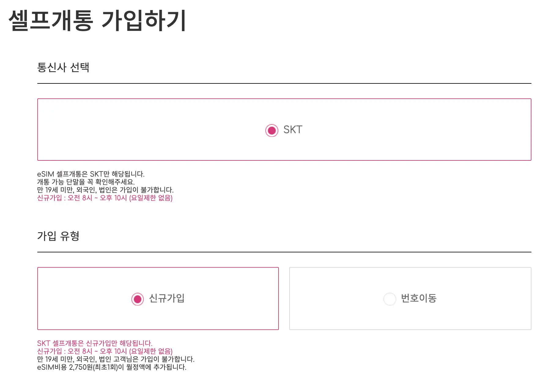 안내 화면에서 뜨는 것과 같이, SKT로만 개통이 가능합니다. SKT + 신규가입을 선택합니다.