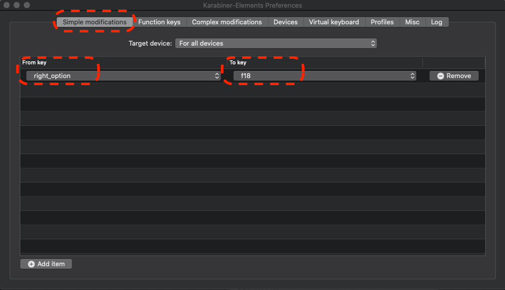 Karabiner-Elements를 설치한다. 그리고, 설정 메뉴에서 다음과 같이 키 등록을 해준다.