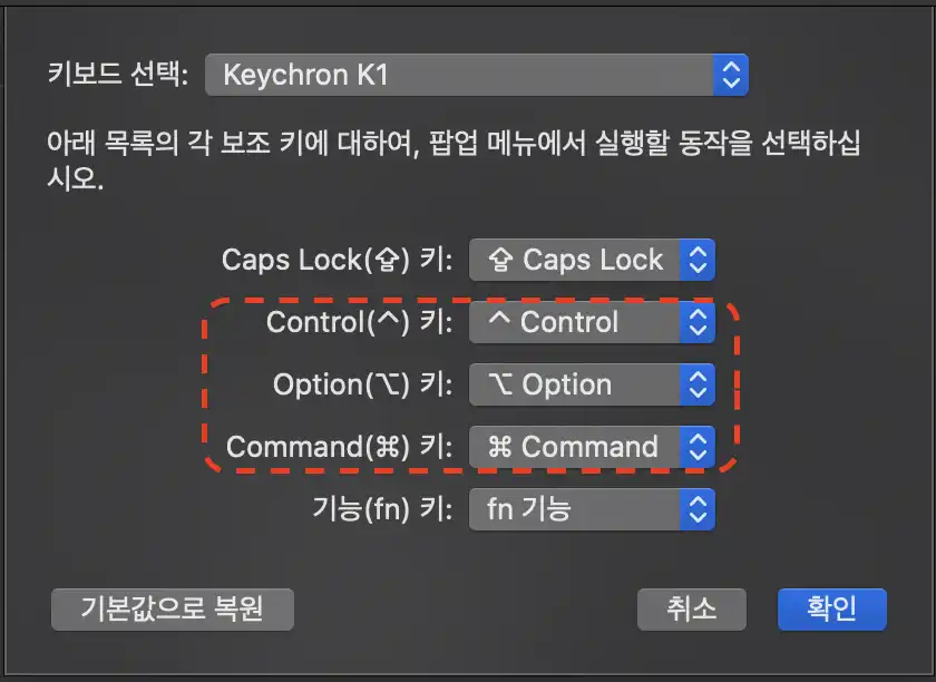 참고로, 키크론 K1 키보드의 경우, 자체적으로 윈도우즈 모드와 맥 모드를 스위치로 조정할 수 있어서 위와 같은 매핑 설정은 필요하지 않다.