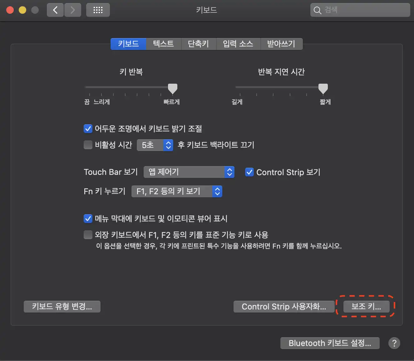 키보드 자체적으로 윈도우즈 모드와 맥 모드를 설정할 수 있는 키보드도 있지만, 그렇지 않은 경우라면 시스템 환경설정 > 키보드를 선택하여 다음과 같이 설정을 변경해 보자.