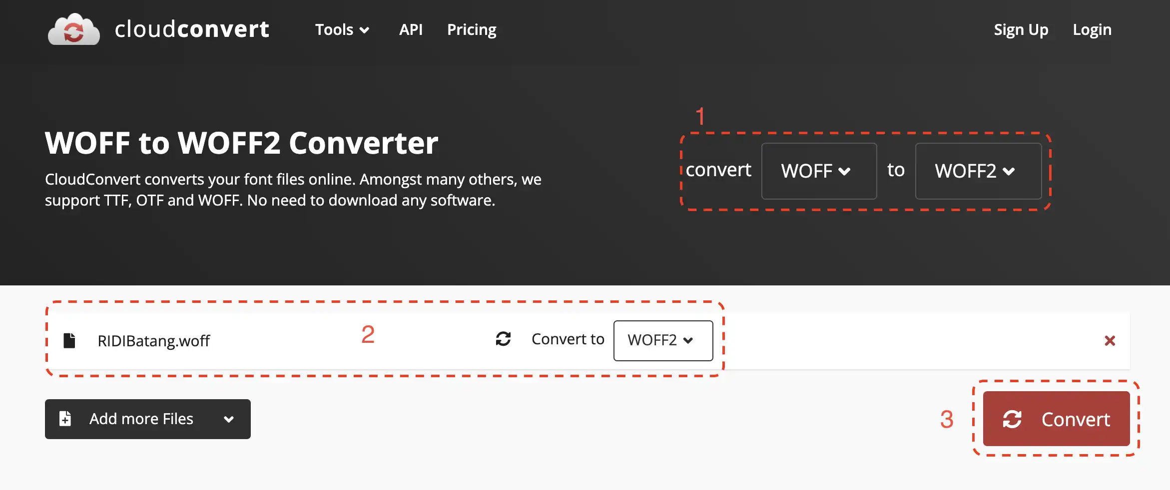 1번 부분의 옵션을 바꿔줍니다. 스크린샷에서 보는 바와 같이 앞의 포맷을 WOFF로, 뒤의 포맷을 WOFF2로 변경합니다. 2번 부분에서 보는 바와 같이 포맷을 변경할 원본 파일을 업로드합니다. 제 경우는 RIDIBatang.woff 파일을 업로드했습니다. 파일 업로드 후, 3번의 Convert 버튼을 클릭합니다.