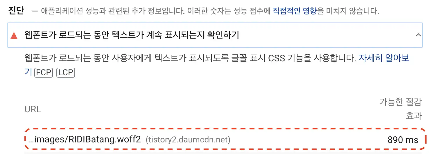 이 옵션을 추가하면, 저 메시지가 사라집니다. 그리고, 웹 폰트를 로딩하는 동안 글씨가 사라지지 않도록 (여전히 글씨가 보이도록) 해줍니다.