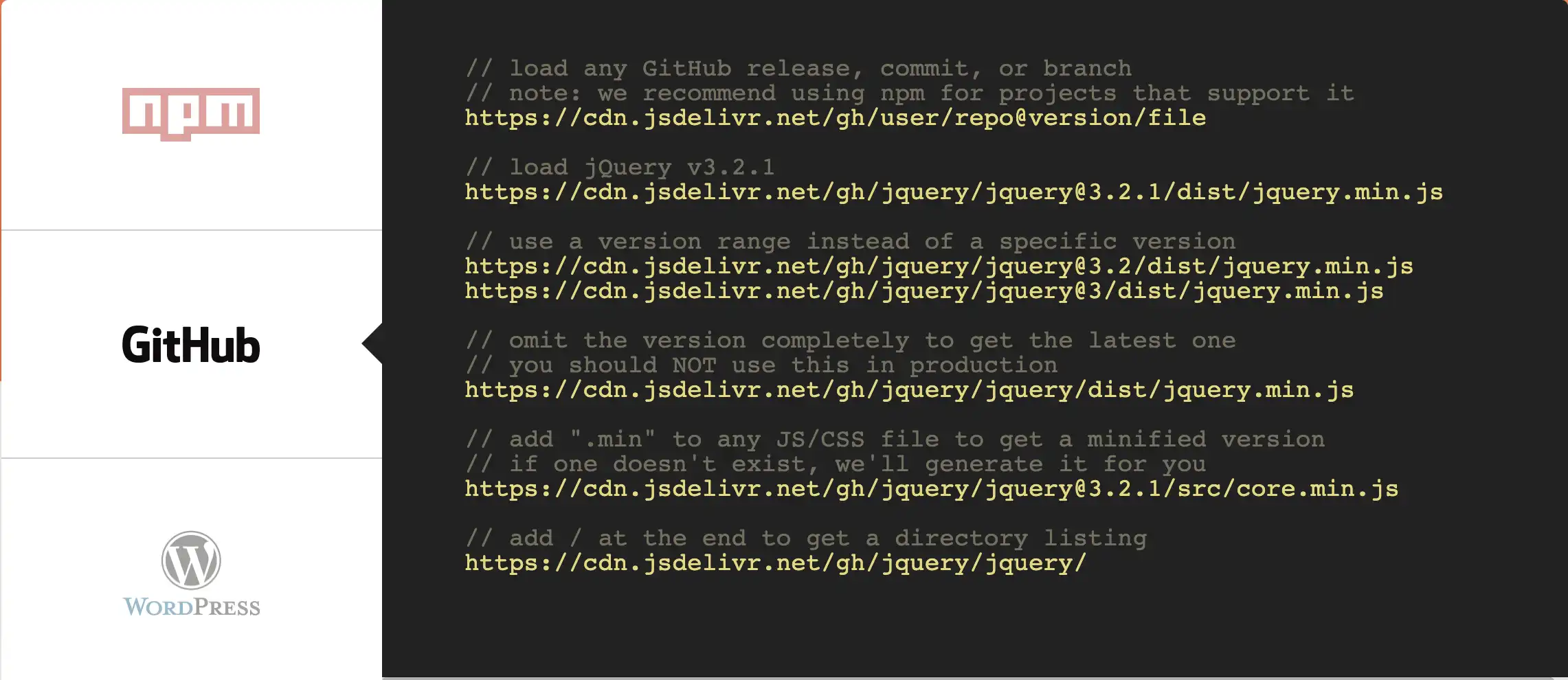 사용하는 방법은 jsDelivr 메인 페이지에 스크린샷으로 잘 안내가 되어 있다.