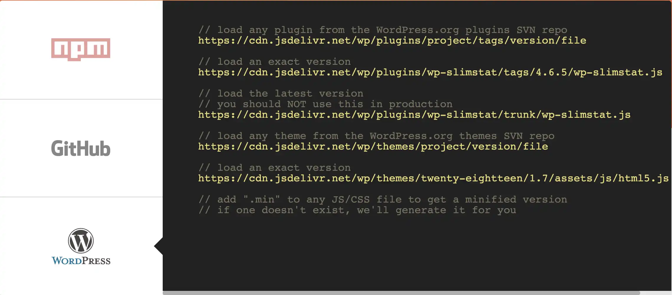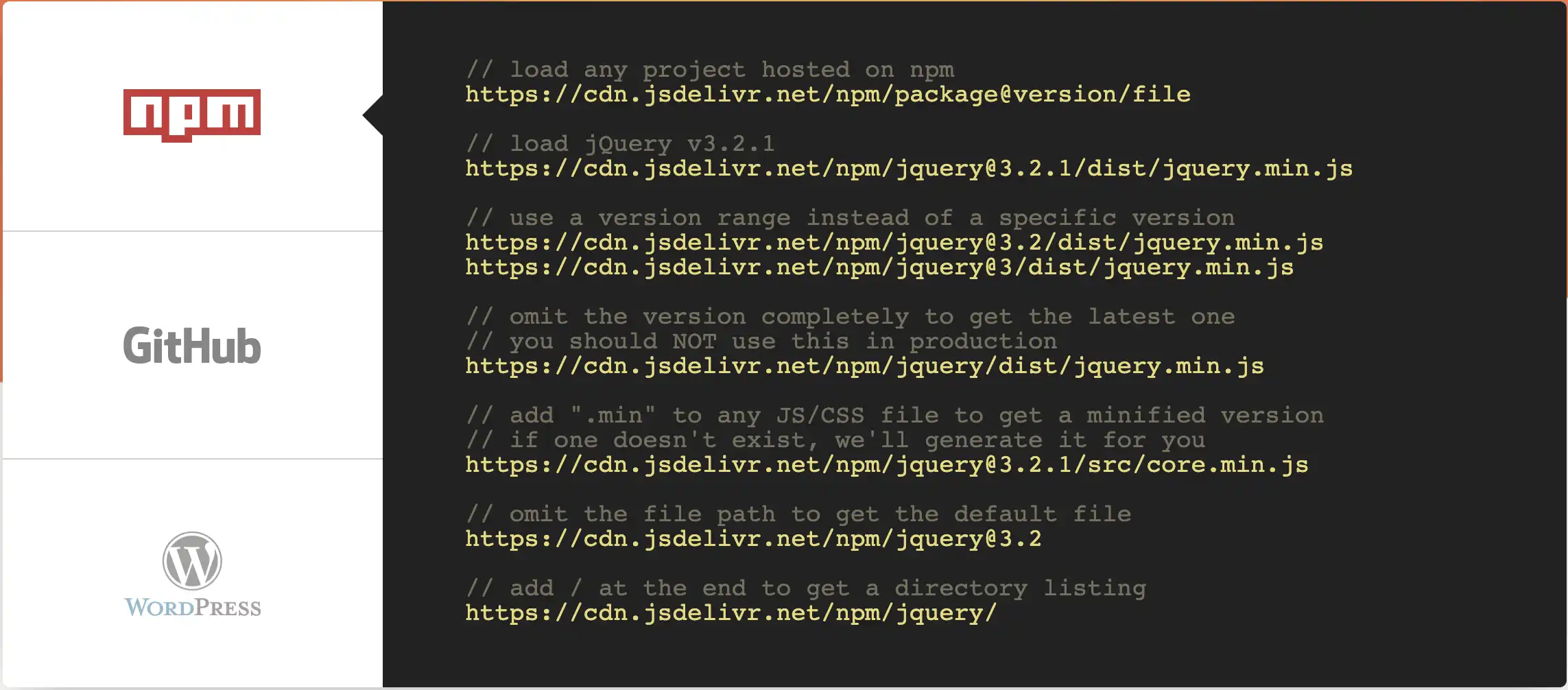 위 스크린샷과 같이, NPM, Github, Wordpress를 기반으로 정적 파일을 CDN에 올릴 수 있다.
