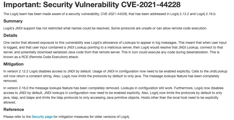 이후 아파치 log4j에서도 위와 같이 해당 문제를 기술하였다.