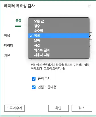 엑셀 콤보박스로 사용자 선택값을 보여주고, 유효성 검사까지