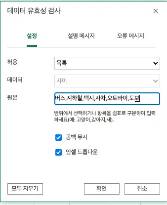 엑셀 콤보박스로 사용자 선택값을 보여주고, 유효성 검사까지