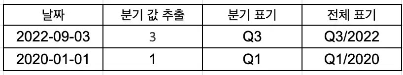Q3/2022라는 결과값을 가공해 줘야 하는데, 각각을 concatenate 하는 영역으로 나눠보자면,