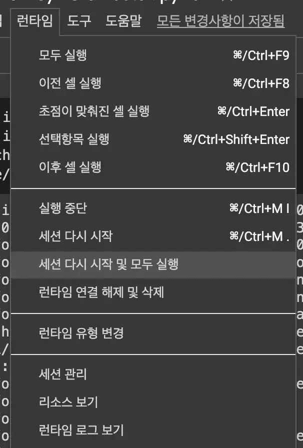시스템 작업을 수행해야 하므로, 런타임을 재실행하고 모든 코드를 순차적으로 재실행 한다.