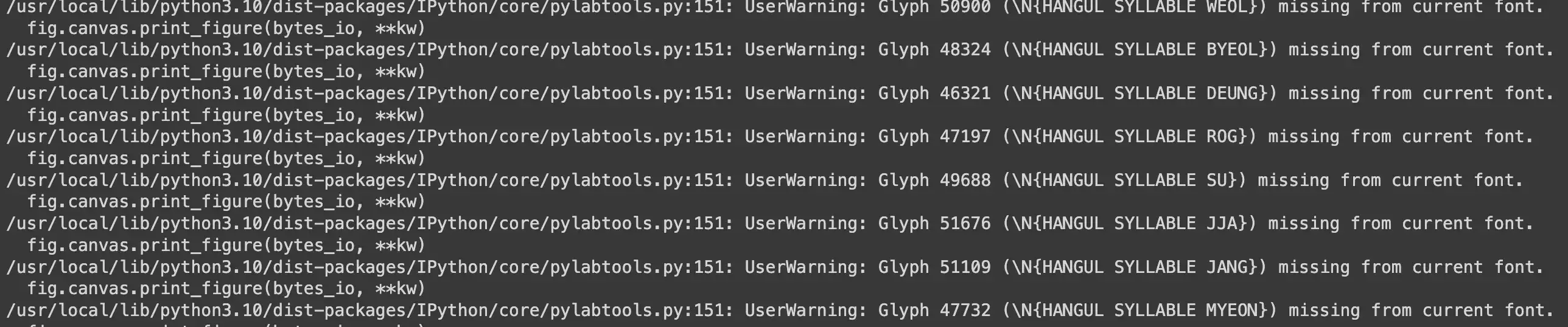 이제 앞서 떴었던 warning 메시지도 사라진 것을 확인할 수 있고, 에러가 발생했던 한글도 정상적으로 출력되는 것을 확인할 수 있다.